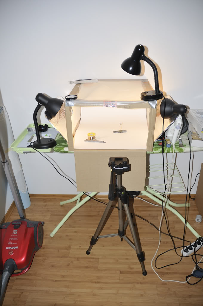 You can see my old “studio” at the above photo. I made it out of a cardboard TV box. I cut a whole at the top and cut out the downward opening flaps at the sides. All the openings were then covered with semi transparent tracing paper. Flaps were further wrapped in wrinkled aluminium kitchen foil to further diffuse the reflected light. Difussin a direct light is very important and even if you don’t want to use such a set-up, just use some tracing paper or even some baking paper you find in the kitchen, cut a piece of it and hold it over a model when taking photos.