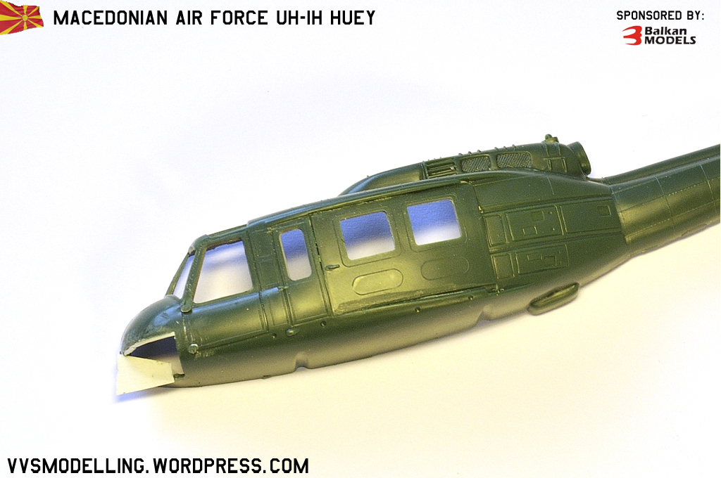 Unfortunately the kit is showing its age and though Huey’s are quite simple machines, this kit ain’t. Dryfitting the clear parts showed a number of discrepancies including the front hole on the left fuselage being too big. Sheet styrene was glued to the attachment points and trimmed to shape to remedy this.