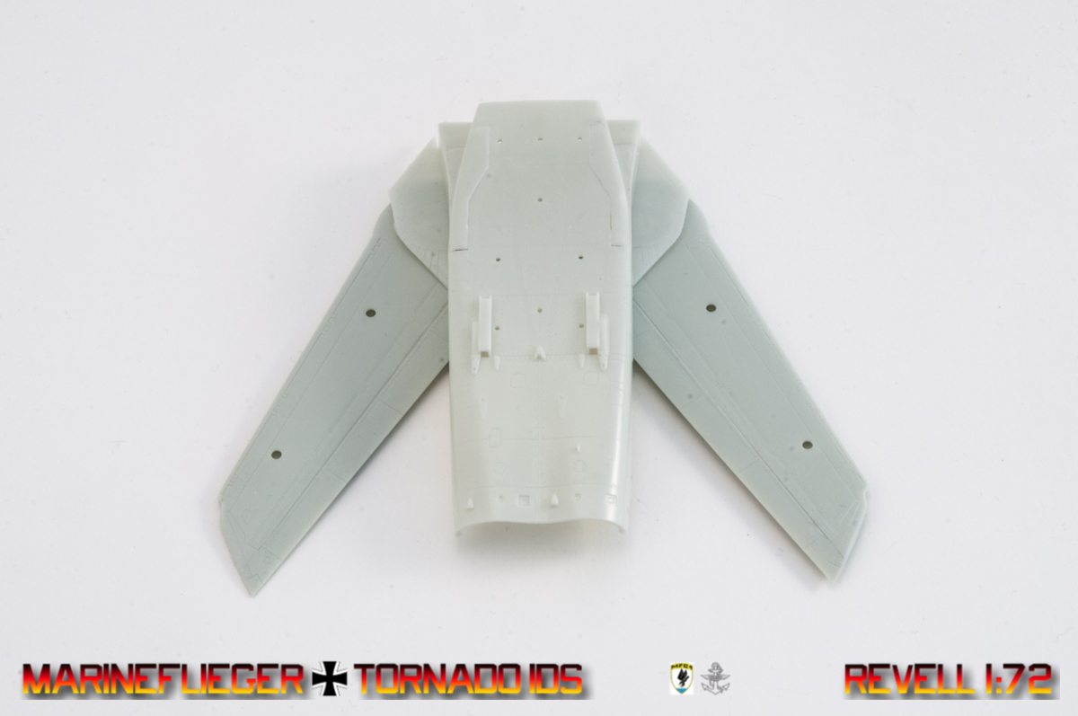 Since this is gonna be wheels up model, gear bays were not installed. This in fact helped positioning the doors which fit rather decently in closed position and only a little bit of filling and sanding are needed for fixing them up. Wings were also glued in full sweep position but if I would do it again, I would fix them later before painting. Why, you might ask? Reason is the fuselage seam that runs below them, which would be easier to clean if the wings would be swept forward.