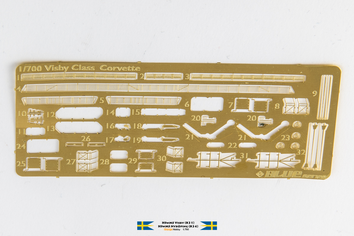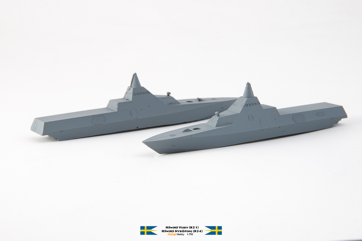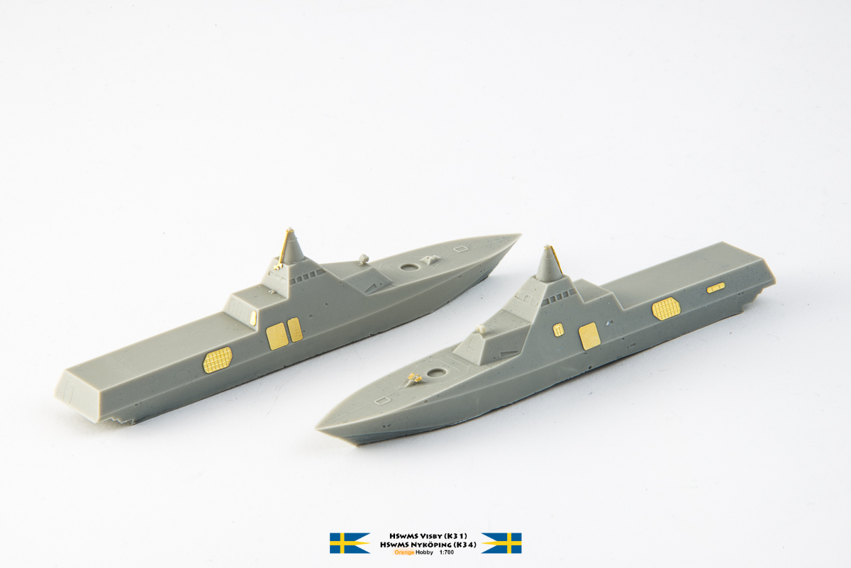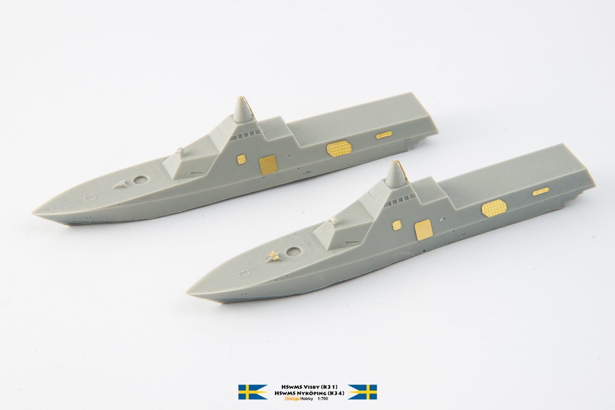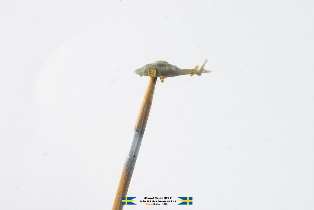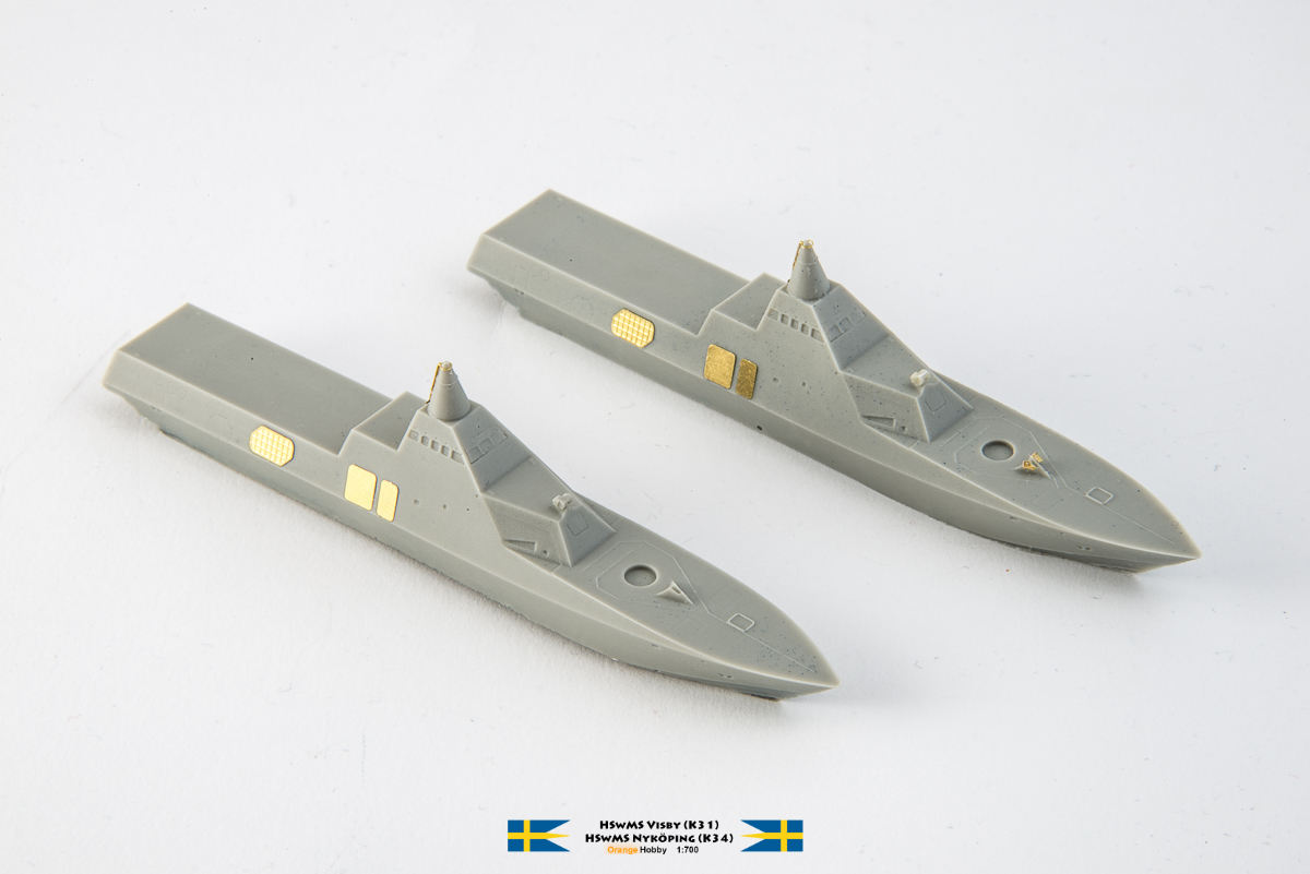 Both ships with some essential PE parts attached. Idea is to pose them on sea base with K31 Visby with gun open and helicopter on deck, while K34 Nyköping will feature full stealth mode.