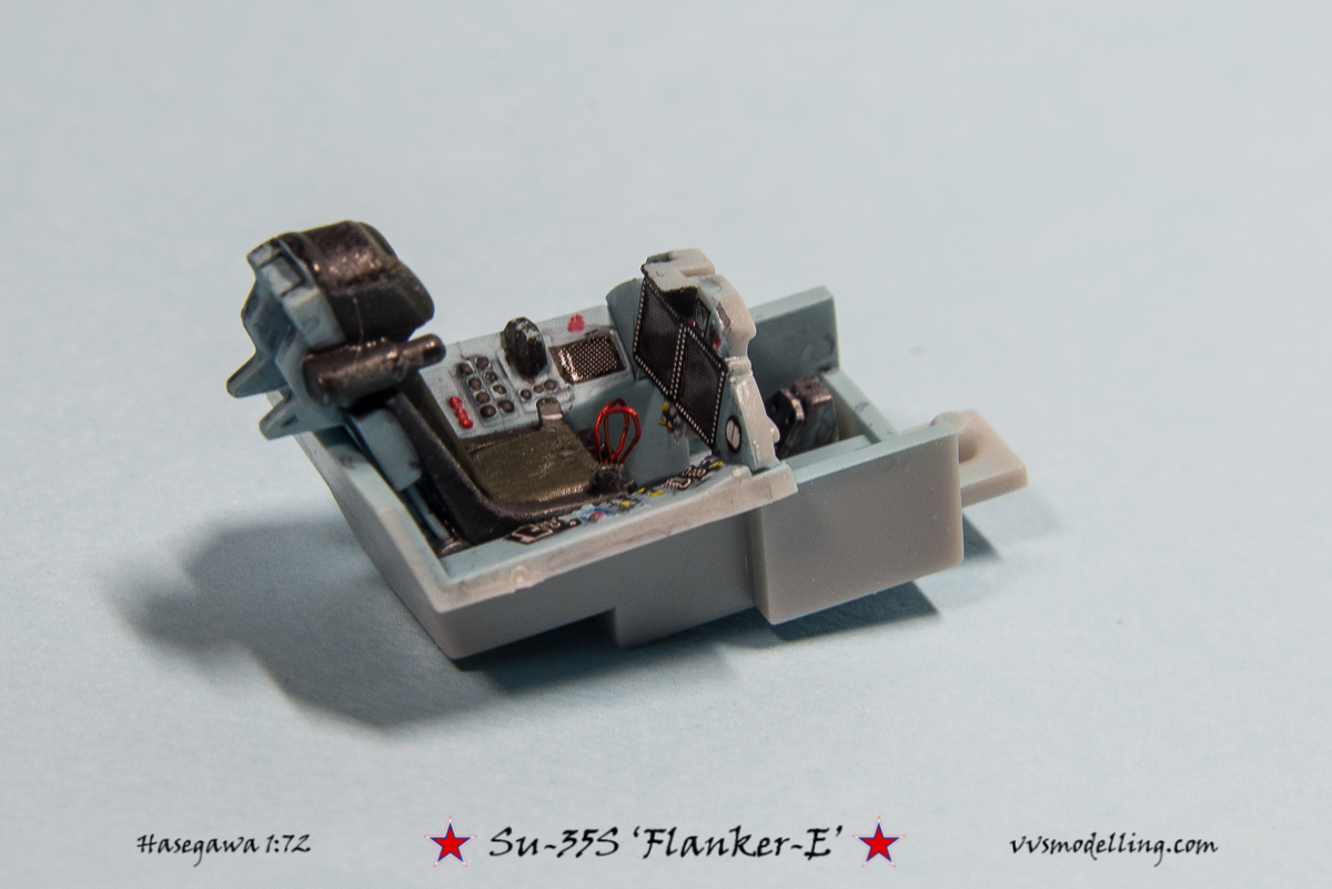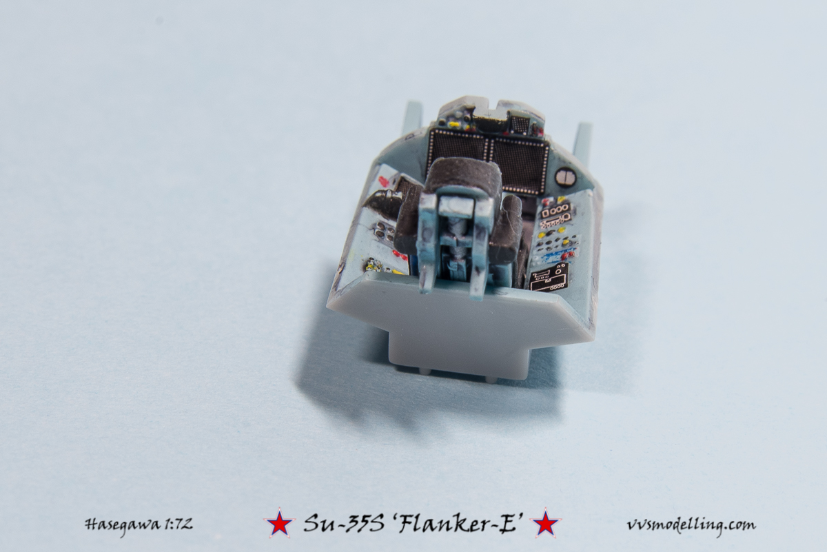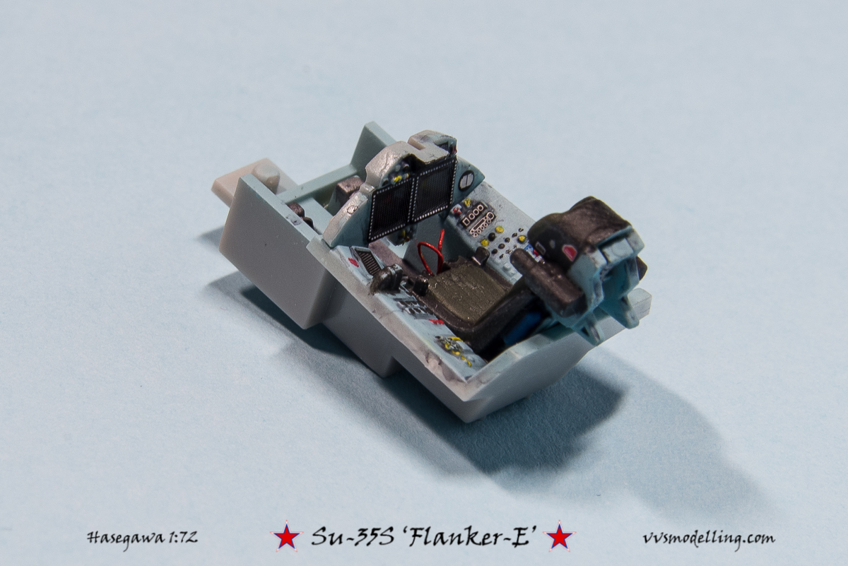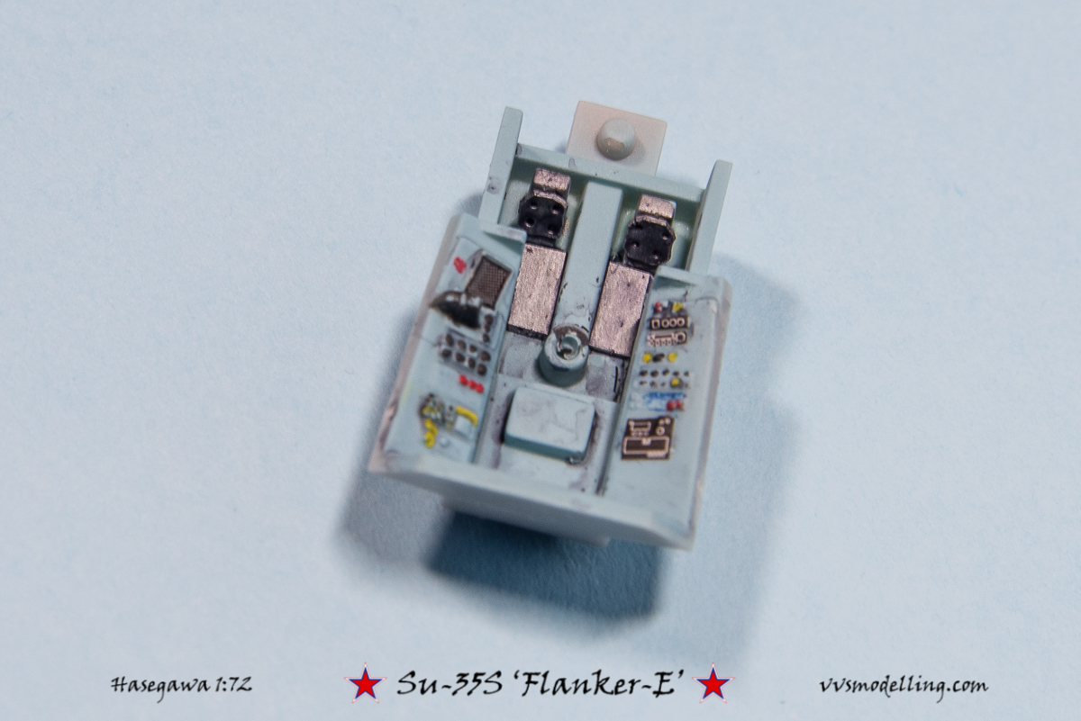 There is an option to use decals for side consoles and instrument panels, but unfortunately they are mostly wrong, as all panels are painted black with white buttons, like on american fighters, while Flanker’s cockpit is a bit more colourful. I have used a few decals though, for the radio station and for all the MFD’s. One little detail I’ve added were new better shaped rudder pedals and the bare metal area before them. Won’t be visible in the end, but it’s there 😉