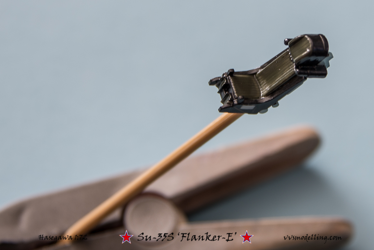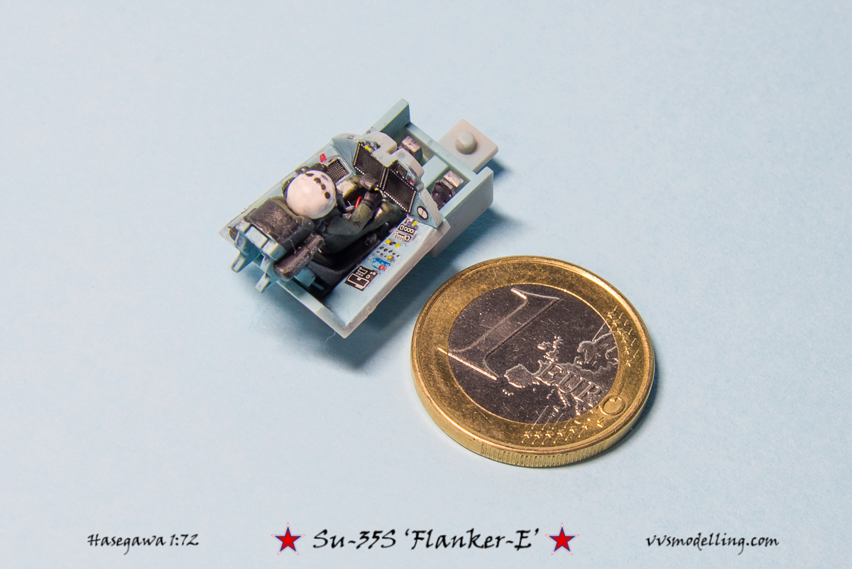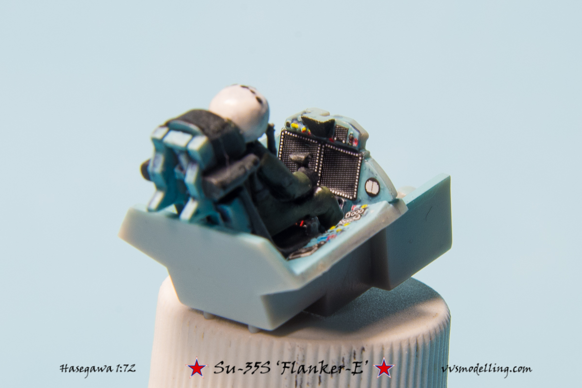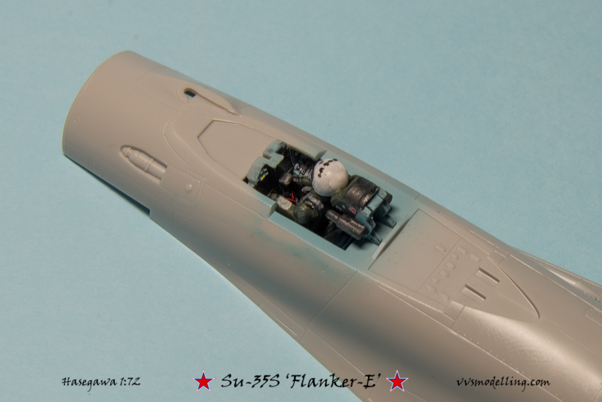 There is an option to use decals for side consoles and instrument panels, but unfortunately they are mostly wrong, as all panels are painted black with white buttons, like on american fighters, while Flanker’s cockpit is a bit more colourful. I have used a few decals though, for the radio station and for all the MFD’s. One little detail I’ve added were new better shaped rudder pedals and the bare metal area before them. Won’t be visible in the end, but it’s there 😉