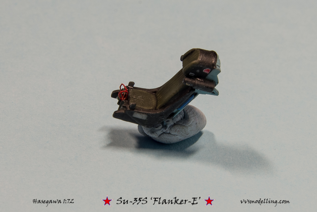 Ejection seat finished. Nice touch are head rest placards decals. Ejection seat handle was made from 0.19mm copper wire as the supplied one is of wrong shape (inverted bell) and too thick. Also notice that painting diagram is wrong – instructions want you to paint whole seat black, while newer version of the seat use olive-green fabric instead of black leather.