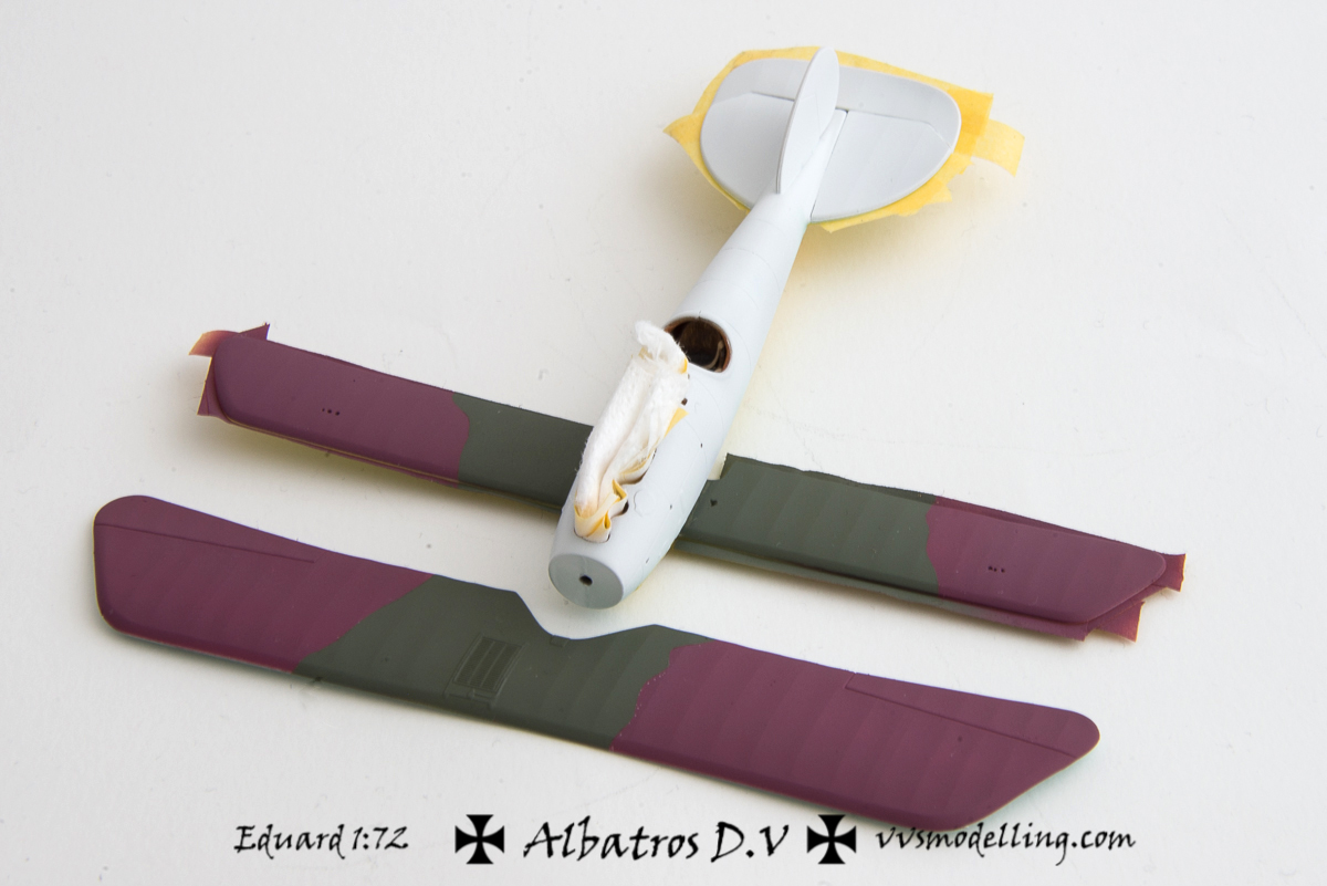 As you can imagine, no, I don’t have purple paint in my paint stock. A few drops of red, a drop of blue and a drop of White and adjusting the quantities of these drops a bit and I got this purple colour. Is it correct for the so called Mauve paint? I don’t know, but asking this question on some WW1 forums will be like opening a can of worms. I might build my next biplane in black and white, as my friend suggested. 😉