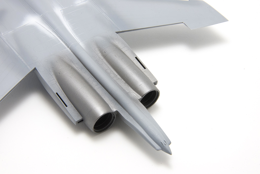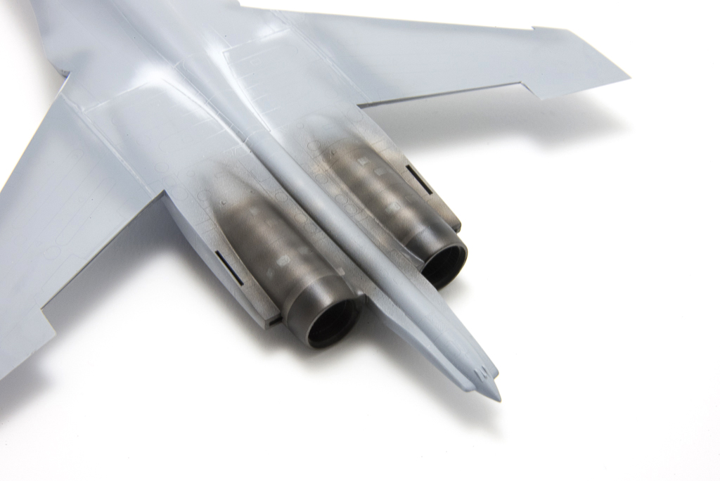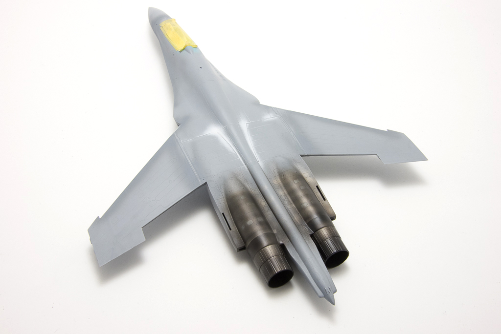 As I said in the previous post, I am not entirely satisfied with this kit. And bringing it close to painting stage showed its faults even more. The plastic is very soft, panel lines rather shallow and there’s way too many sprue gates. In practice, this means, there’s gonna be a lot of clean up work, which will sooner than later lead to some lost detail, while sanding will create dents in the soft plastic, which will need puttying, sanding and rescribing to complete the circle. And this is the work I hate the most at modelling. But anyway, I have managed to bring the model somehow to this point, where I could start painting the engine/exhaust parts, so characteristic of the Flankers.