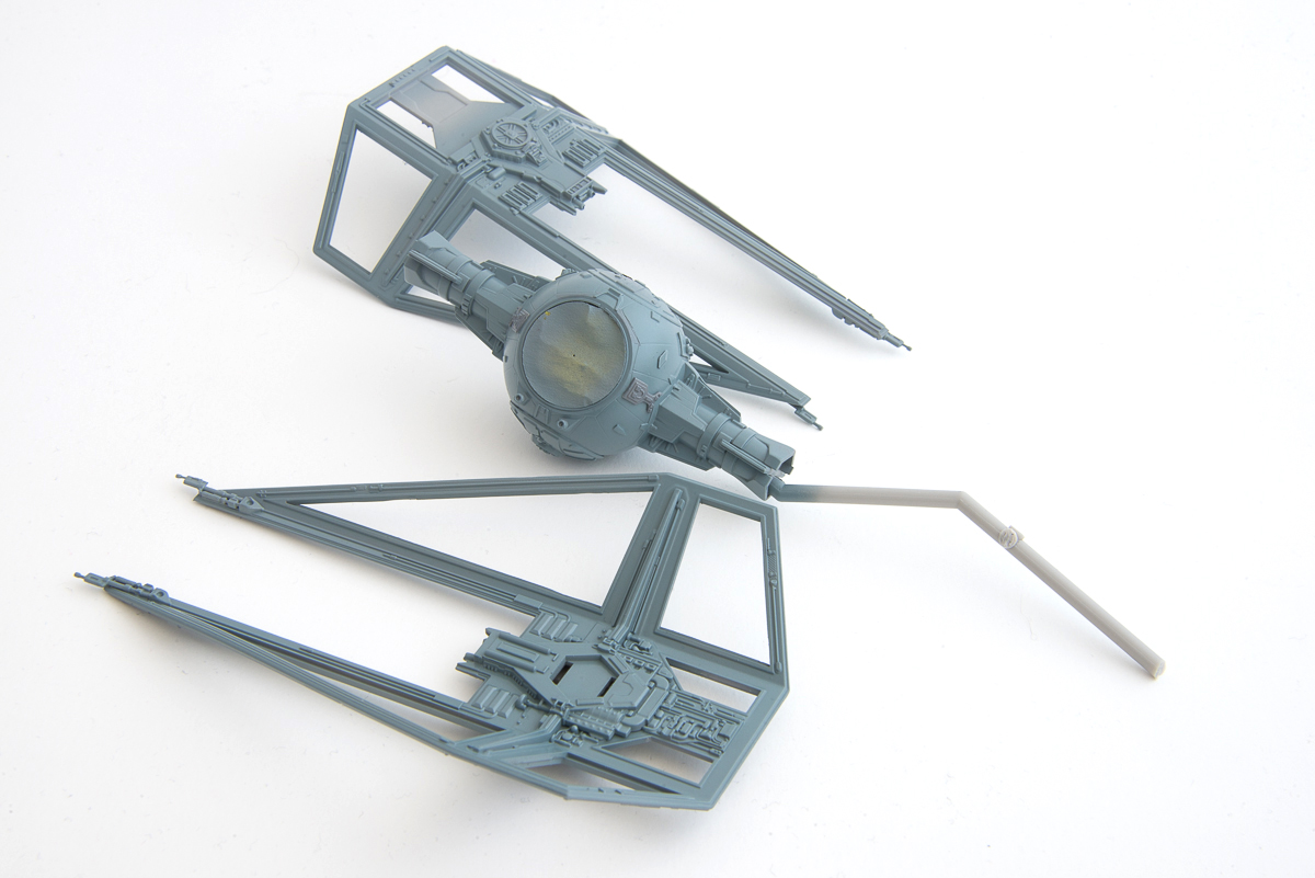 Much has been said about the colours, these TIEs should be painted in. While the general consensus is that Air Superiority Blue is THE correct colour, which was used on studio models, I find it way too blue on these 1:72 models and by comparing it to the shots from the movie. I have used ModelMaster 1721 (FS35237) Medium Grey, which is basically very blueish grey and really liked the result.