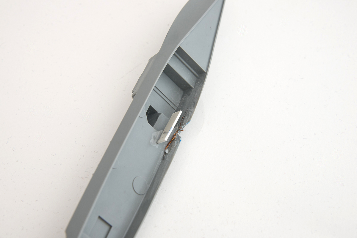 First step was to make the damaged hull – sanding the inside of the hull to thin it as much as possible, then cutting out a piece and bending the remaining parts inward.