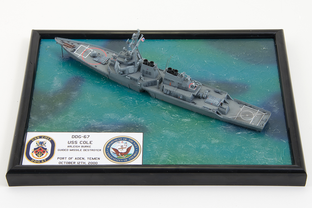 USS Cole was commissioned as 17th Arleigh Burke destroyer on March 11th, 1996. On October 12th, 2000, while anchored at the port of Aden, Yemen, a group of Al-Qaeda suicide bombers sailed a small boat to the port hull and detonated explosive charges creating a hole 12m wide, killing 17 crew members and injuring 39. The ship was later transferred to the United States aboard a Norwegian heavy cargo ship MV Blue Marlin for repairs and resumed operational duty in April 2002.