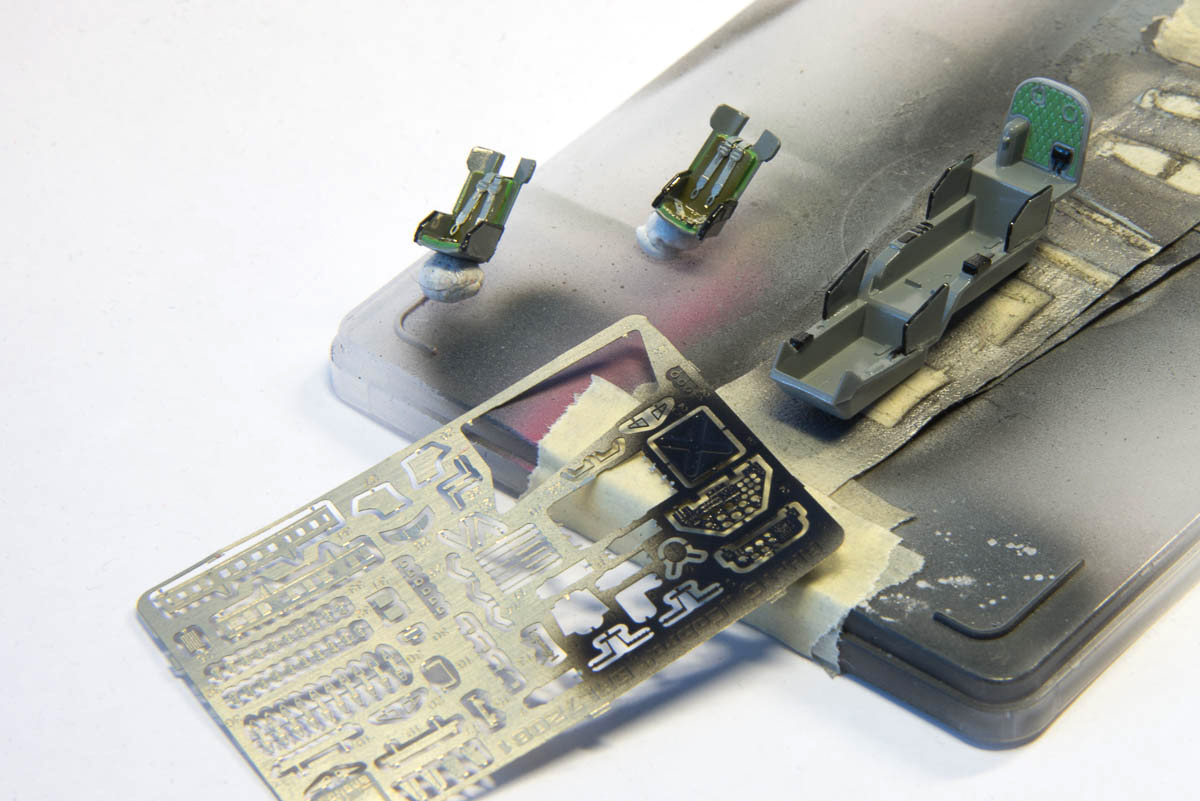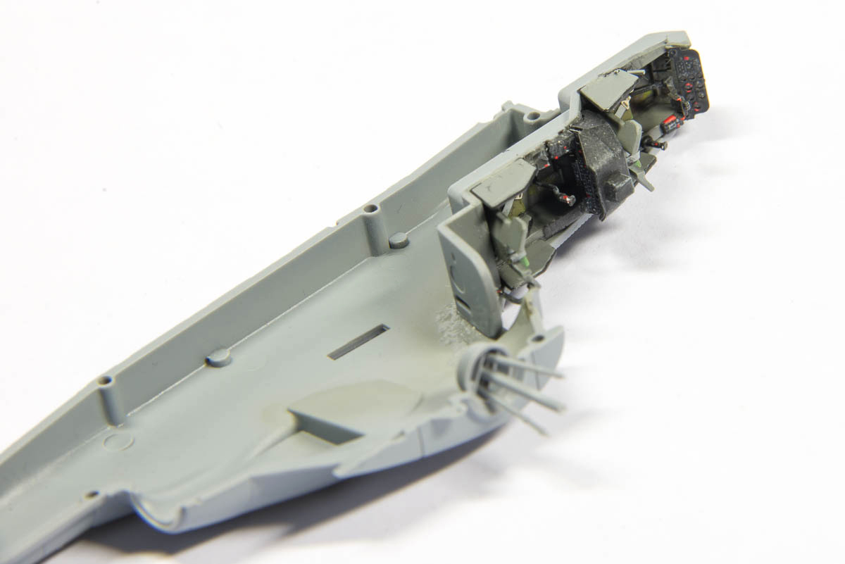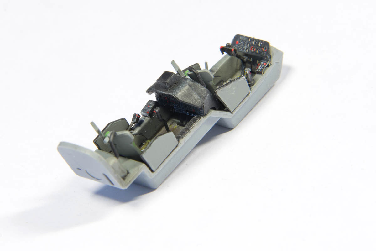 With the addition of seats, the cockpit is more or less finished. I will add the pilot’s gunsight glass later, just before attaching the canopy, to avoid any breakage during construction.