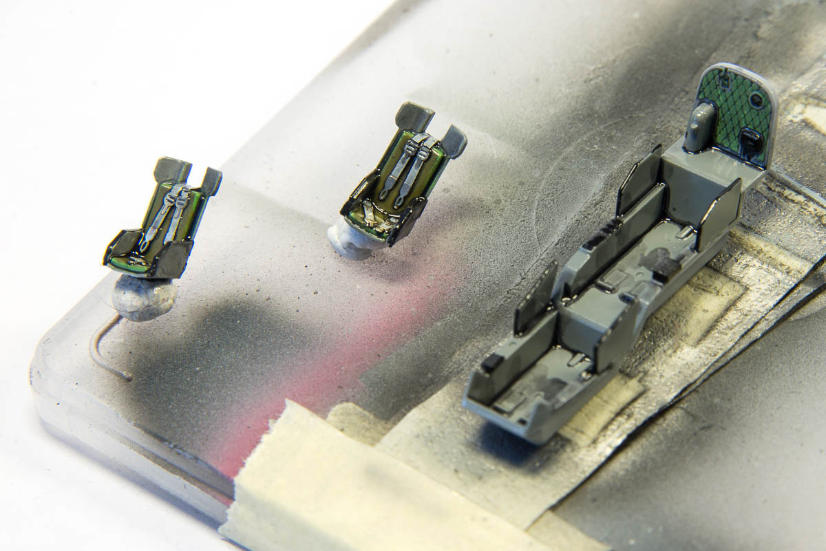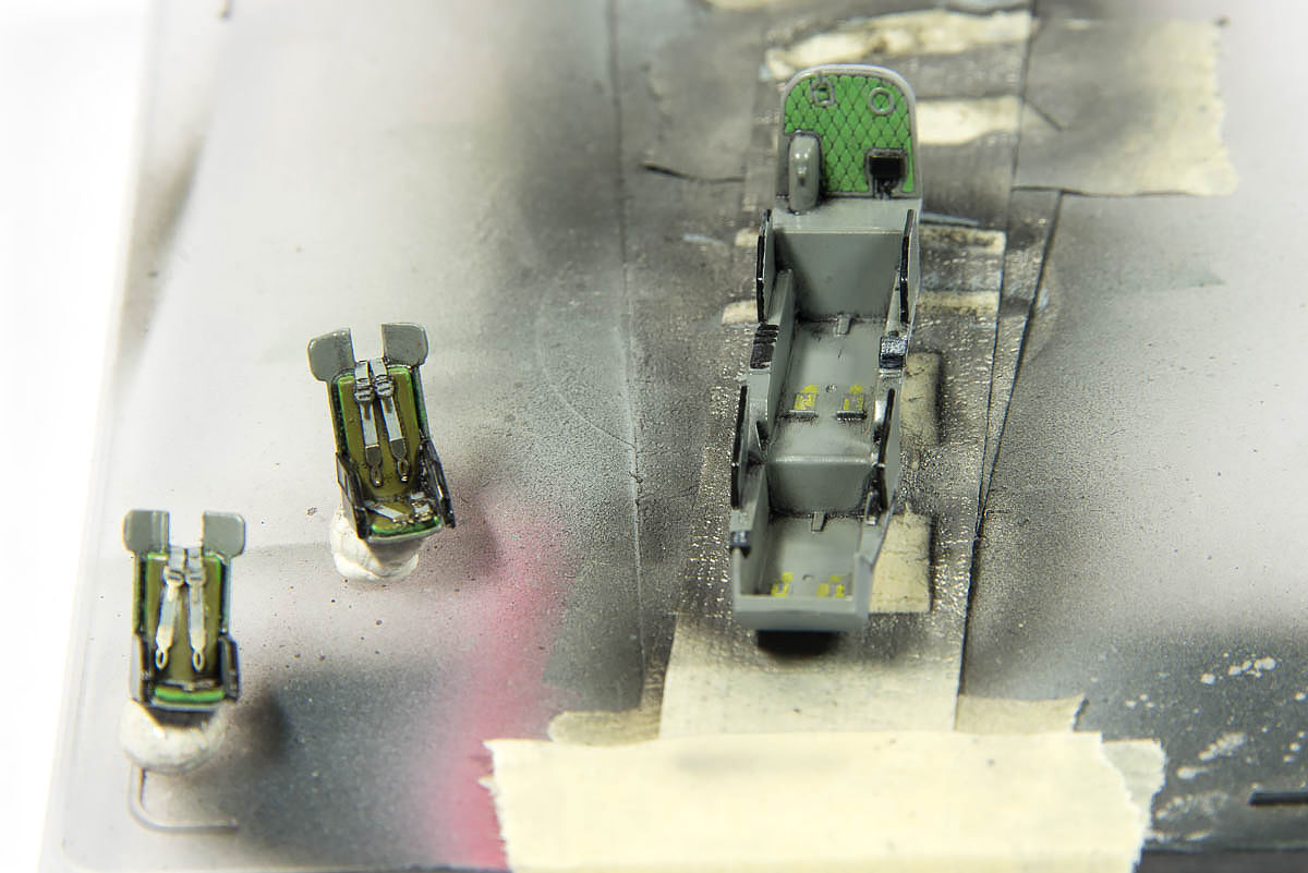 I am using Brengun photo-etched set for this kit as only aftermarket item. While MPM offers resin replacement seats, they are pretty simple affair and I’ve decided to use the kit ones. Combined with etched harnesses, they look convincing enough. The seats, instrument panels and cockpit tub were painted in their basic colours and given a coat of Future to protect them from further work.