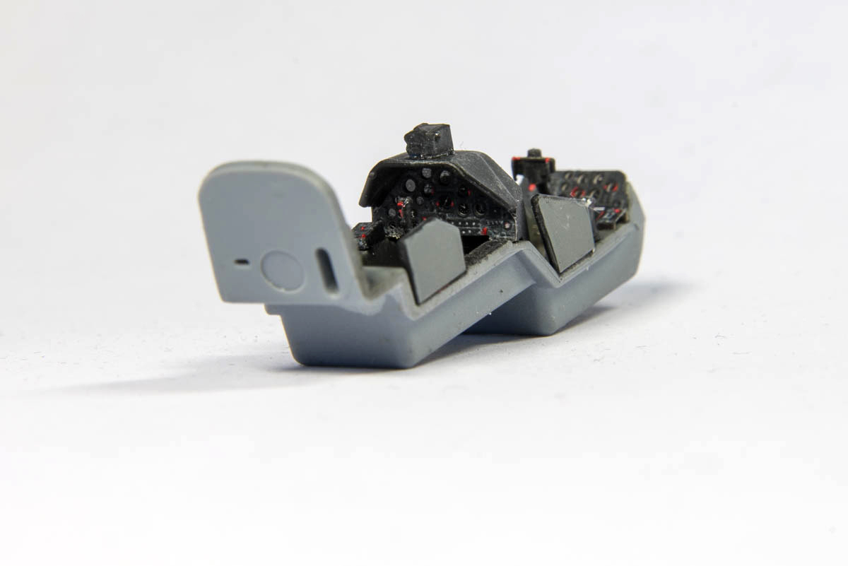 Using the light grey paint, I drybrushed several exposed areas, which would normally look rather bland under just a coat of black paint. Red buttons and indicators were applied using a thicker enamel paint applied with a sharp-pointed toothpick and the use of optivisor. I really love how the instrument dials shine from the otherwise flat instrument panel.