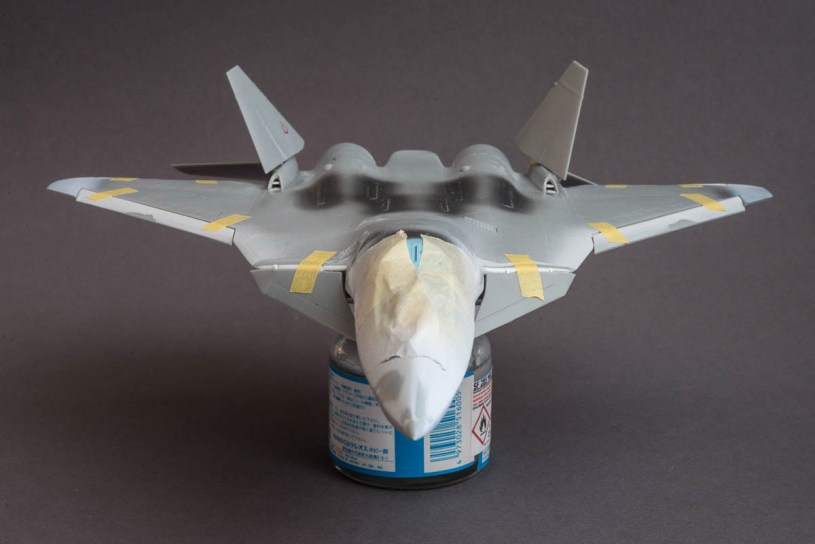 And here she is – All the manuvering surfaces temporarily attached to finally show her shape. There are some little things still to be done, but she is surely getting to the primer stage.