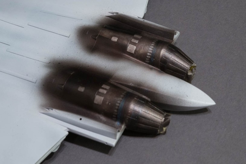 Thrust vectoring engine equipped Sukhois have downward and inward turned nozzles when shut down. According to the reference photos, they can be either closed or open. I’ve cut the nozzles at the angle and while this not being the perfect solution, with some sanding and adjusting it creates convincing enough effect.