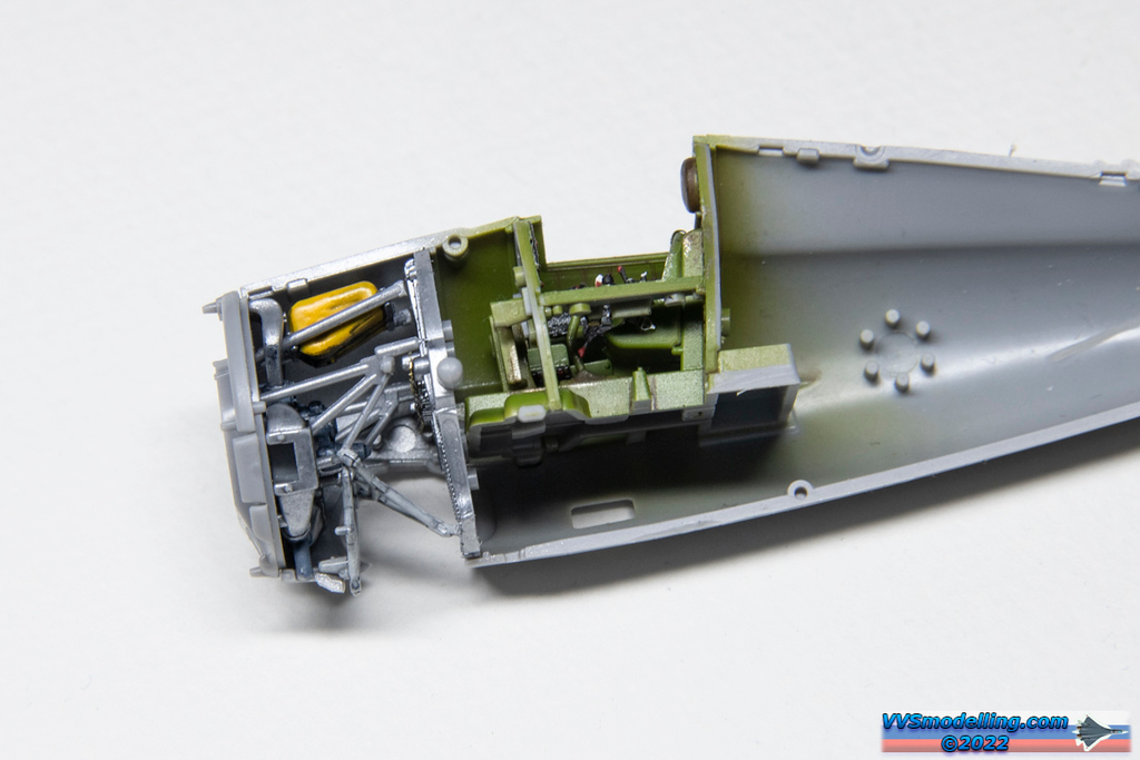 A busy front end of the Wildcat full of support struts and rods… and not to mention an entire landing gear assembly is still missing in the photo.