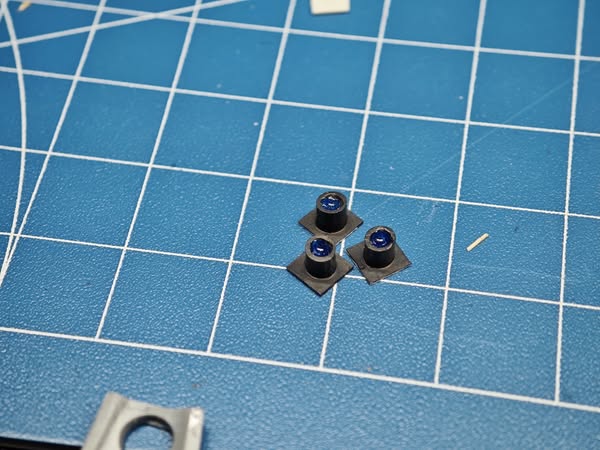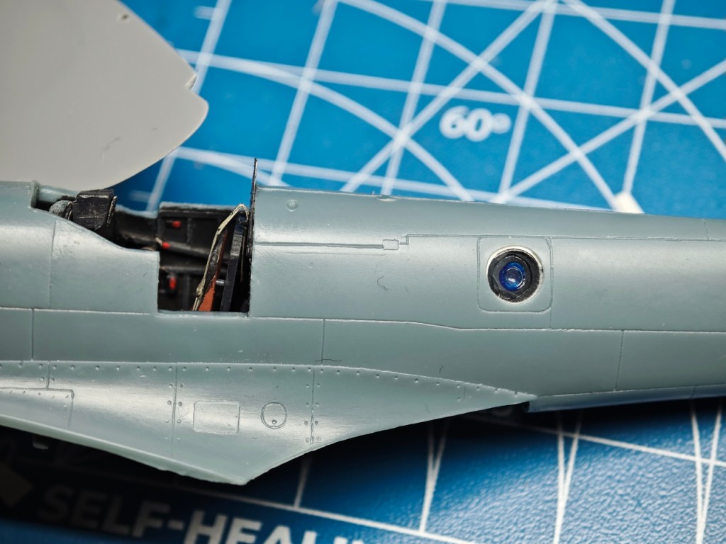 The kit comes with clear camera ports, but no cameras. So if I’d be just following the instructions, I’d be getting a see through the fuselage behind the cockpit. So I took some sheet styrene and some leftover sprues, cut those and drilled out the lens, painted them up, and well – they might not look entirely correct, but they beat the see through effect any day.