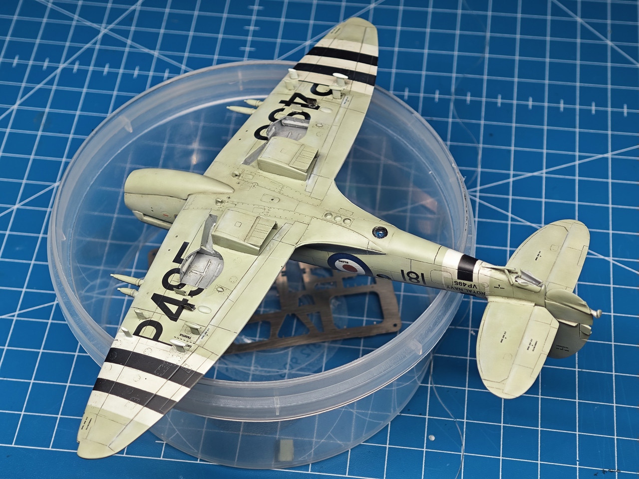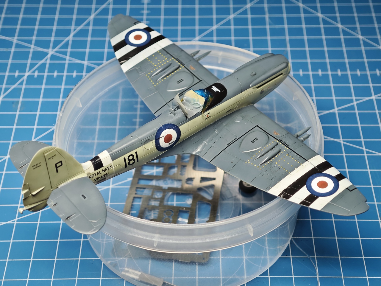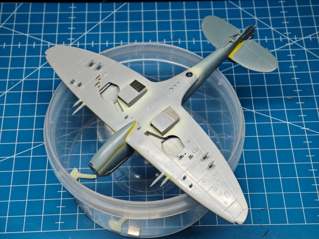 Bottom side of the Seafire completed. Parts fit rather well. The yellow green you see in some joins is AK’s marker which I use to quickly see if the joins are clean and tidy. The most fun I had was attaching those rocket pylons – they are not marked in any way on the plastic itself and you need to actually measure distances from the panel lines and wing leading edge to locate the correct spots.