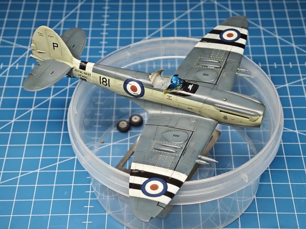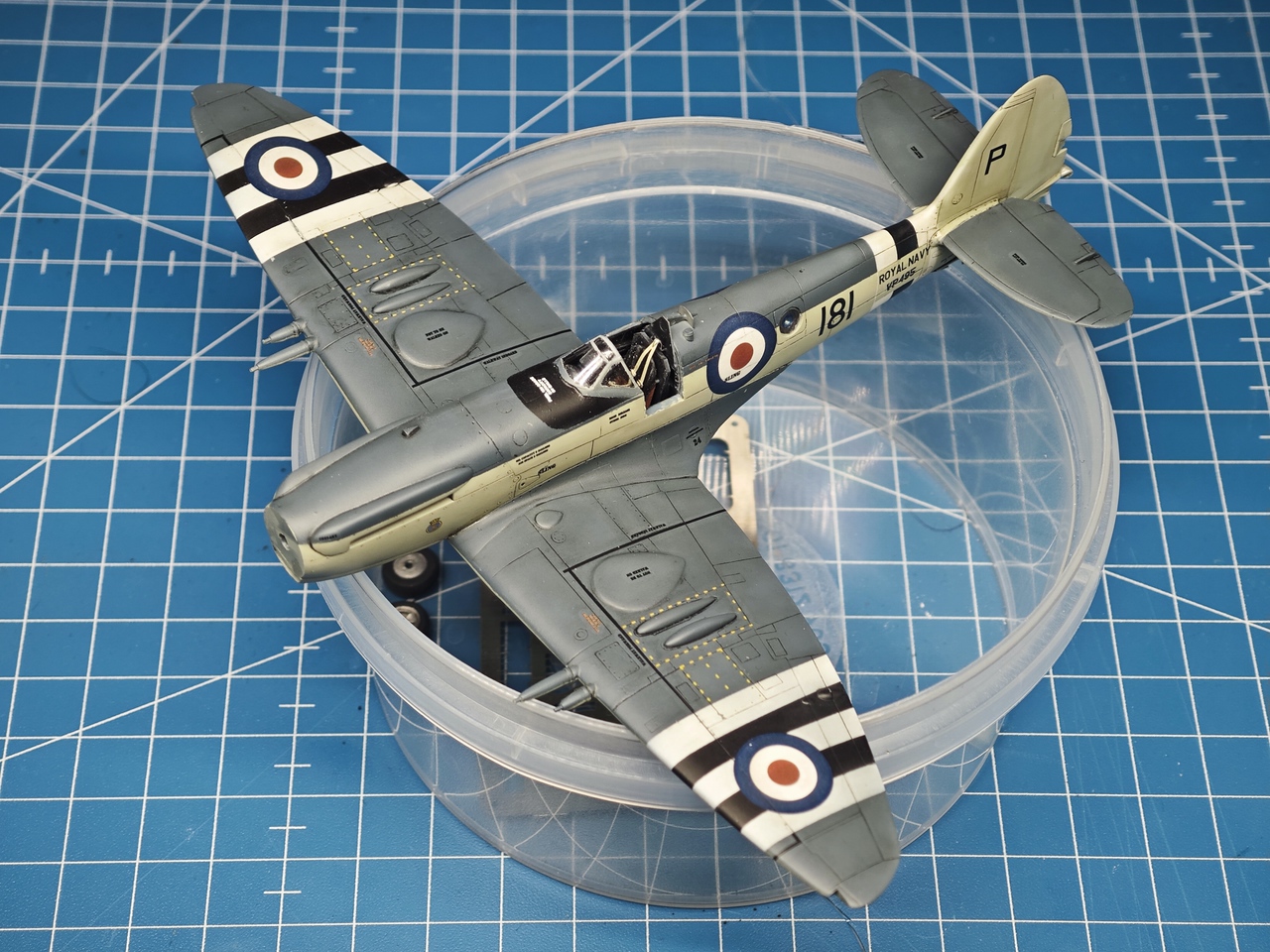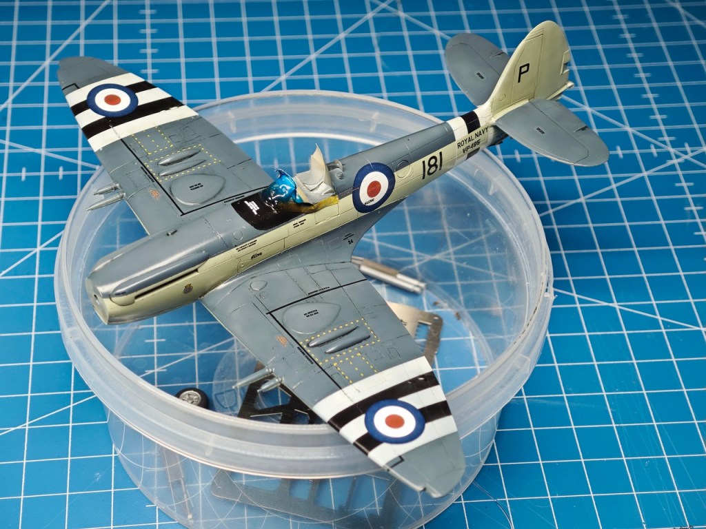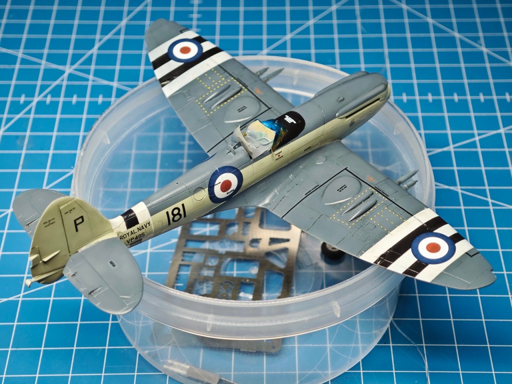 Bottom side of the Seafire completed. Parts fit rather well. The yellow green you see in some joins is AK’s marker which I use to quickly see if the joins are clean and tidy. The most fun I had was attaching those rocket pylons – they are not marked in any way on the plastic itself and you need to actually measure distances from the panel lines and wing leading edge to locate the correct spots.